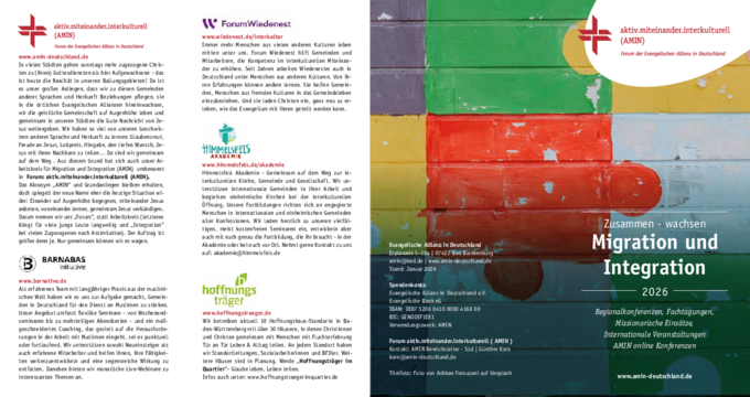 Übersicht mit Terminen zu Regionalkonferenzen, Fachtagungen, Missionarische Einsätze, Internationale Veranstaltungen und AMIN online Konferenzen im Jahr 2026 in einem Flyer.